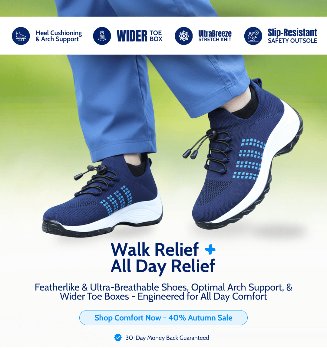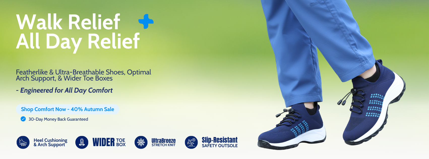 Cushioned arch shoes support sore joints (arthritis), heel pain (plantar fasciitis), & general achy feet for all day comfort